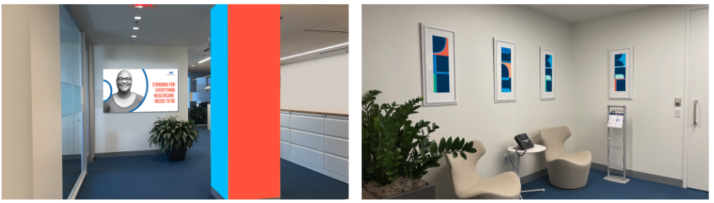 Bringing the brand to life in the physical office space, using colors, typographic elements and brand-approved shapes and styles