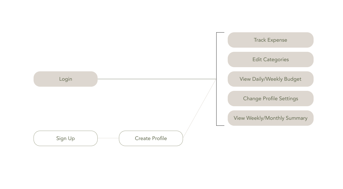 I mapped out a very simple user flow where they can either log in or sign up/create a profile. Once they log in, they can: