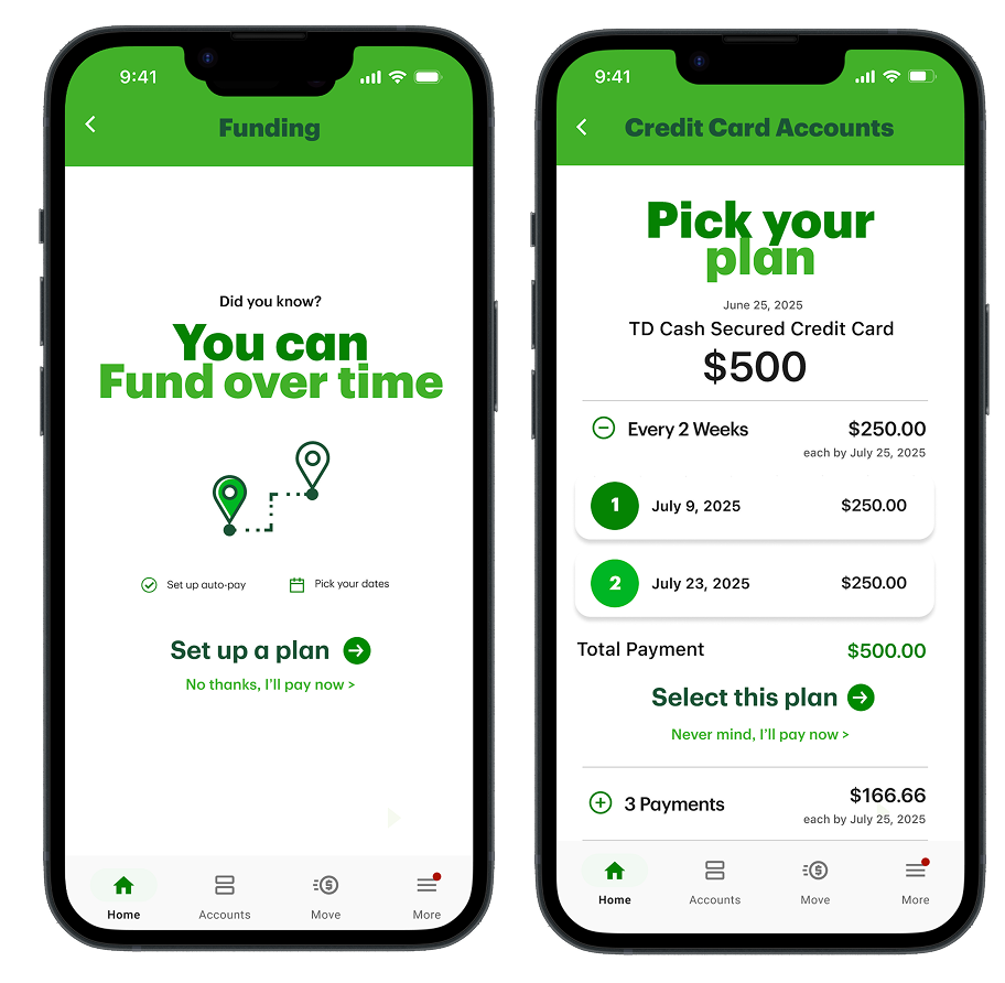 A new feature I proposed: the ability to fund your account in increments, which is different than how TD allows customers to fund Secure Credit Card accounts today. I drew inspiration from other financial institutions like Affirm and Chase’s “pay-over-time” credit card feature.